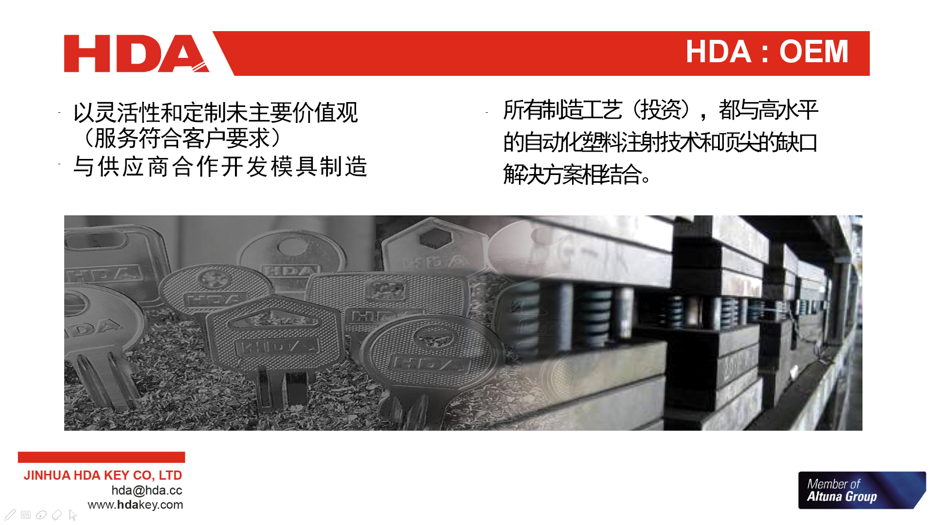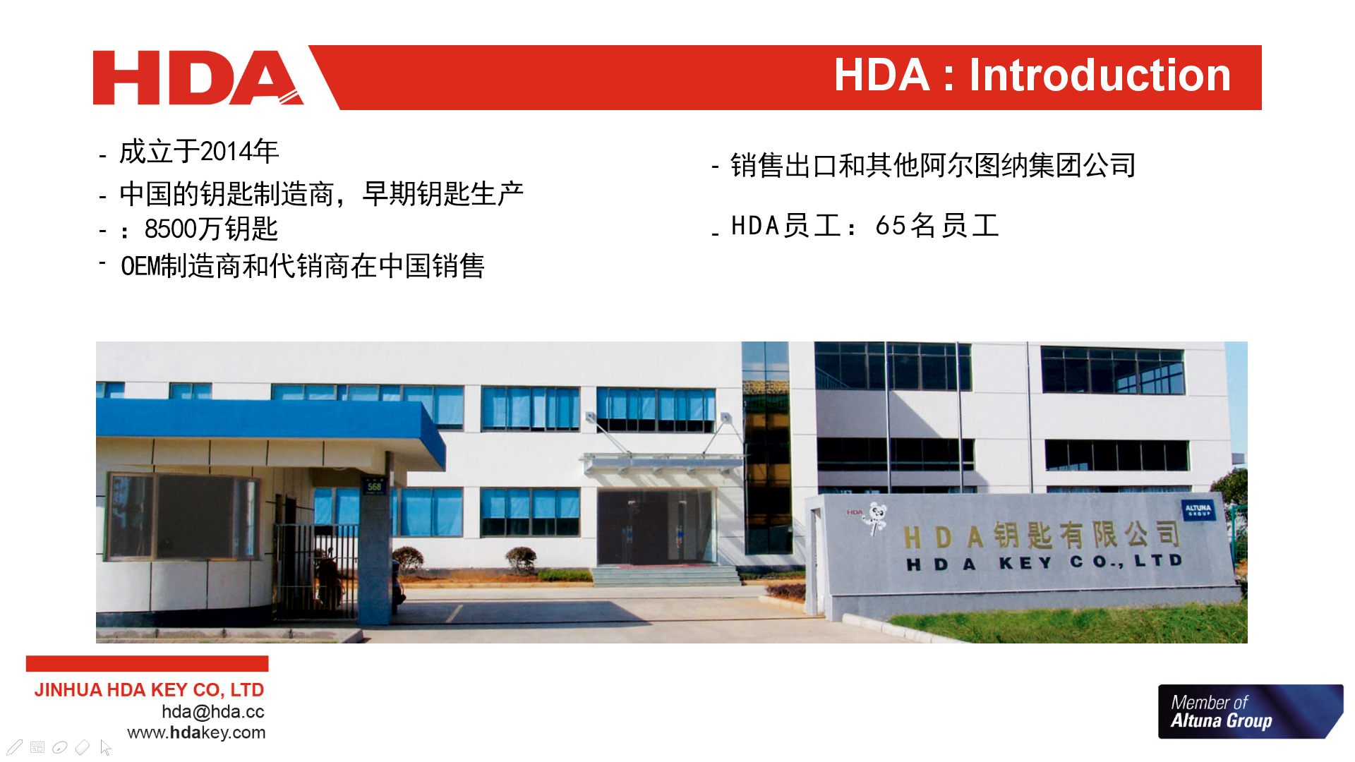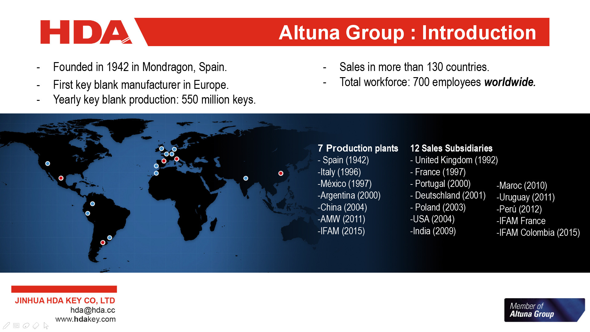 2005年,與歐洲三大鑰匙坯生產企業(yè)之一的西班牙JMA集團成立合資公司--金華HDA鑰匙有限公司。 2007年,轉為西班牙JMA集團獨資子公司。